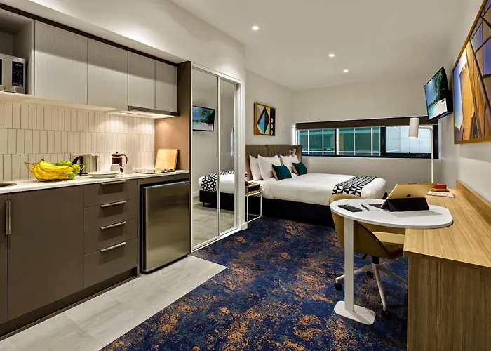 Quest Macquarie Park, a 4-star Sydney hotel with an 8.2/10 rating on Booking.com, offers serviced apartments ideal for families and larger groups. It features a fully equipped kitchen in each room and access to an in-house gym and BBQ area.