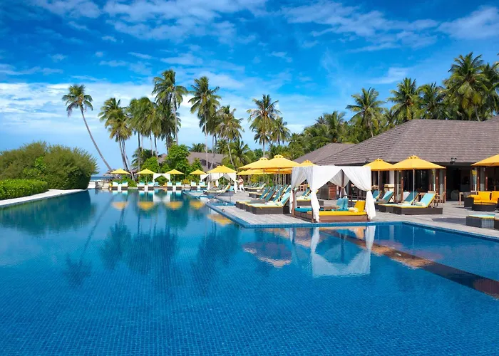 Atmosphere Kanifushi, a 5-star hotel with a 9.5/10 rating on Booking.com, features spacious villas and an extensive spa. The resort provides a wide range of dining options and leisure activities, making it suitable for family holidays.
