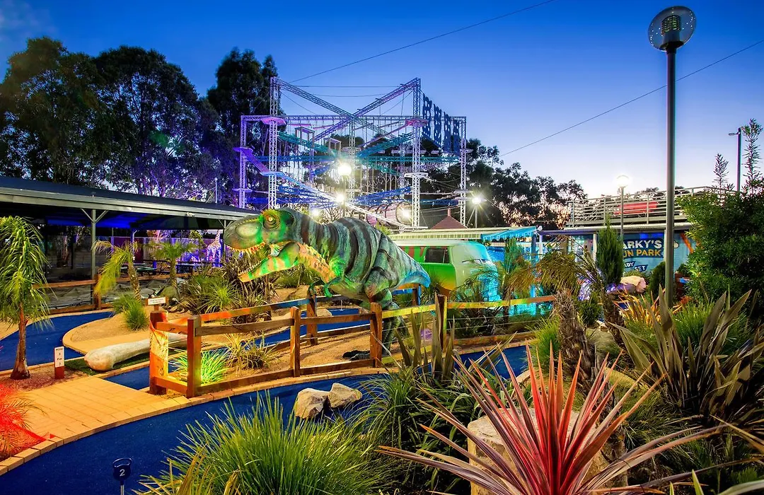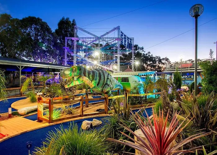 Leisure options include Parky's Fun Park, featuring adventure courses, laser tag, and mini golf. Visitors can unwind with nature trails and enjoy the local wildlife, such as kangaroos and native birds.