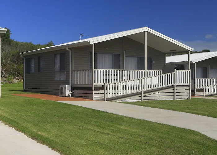 Accommodations at Corrimal Beach Tourist Park include cabins with features designed for guests with reduced mobility, fully equipped kitchens, private bathrooms, and air conditioning. Many cabins also feature large undercover verandahs with views of the Illawarra Escarpment.