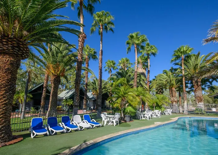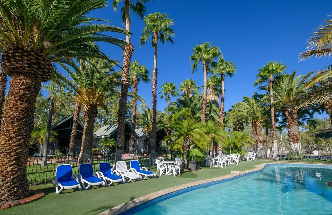 Desert Palms Alice Springs is a 4-star Alice Springs hotel featuring individual studio villa accommodations set around a crystal clear free-form pool with an island and waterfall. The property is bordered by palm trees and lush gardens, providing a tranquil environment.