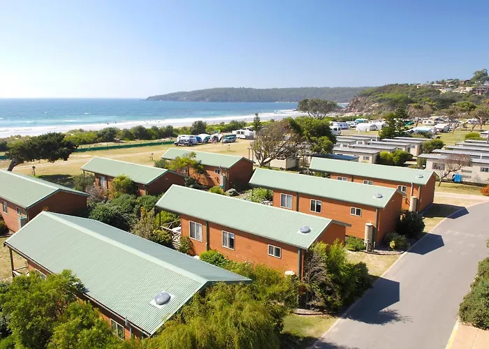 Discovery Parks - Pambula Beach is a 4-star holiday park offering beachfront accommodations on the Sapphire Coast. The park features a waterpark, splash play areas, and a resort-style swimming pool. It is surrounded by Beowa National Park, providing direct access to hiking trails and pristine beaches.