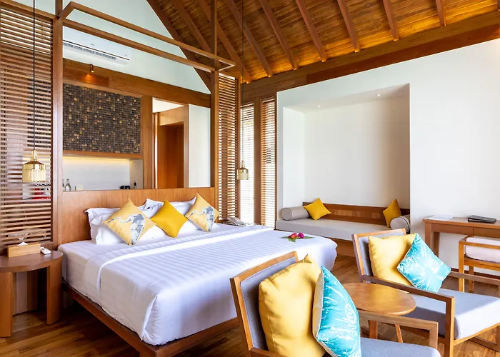 Furaveri Maldives offers various room types, including opulent Beach Pool Villas with private pools, spacious Beach Villas, and Garden Villas designed to connect guests with nature. Each accommodation features modern amenities like air conditioning, a minibar, and flat-screen TVs, along with stunning views of the ocean or the lush tropical surroundings.