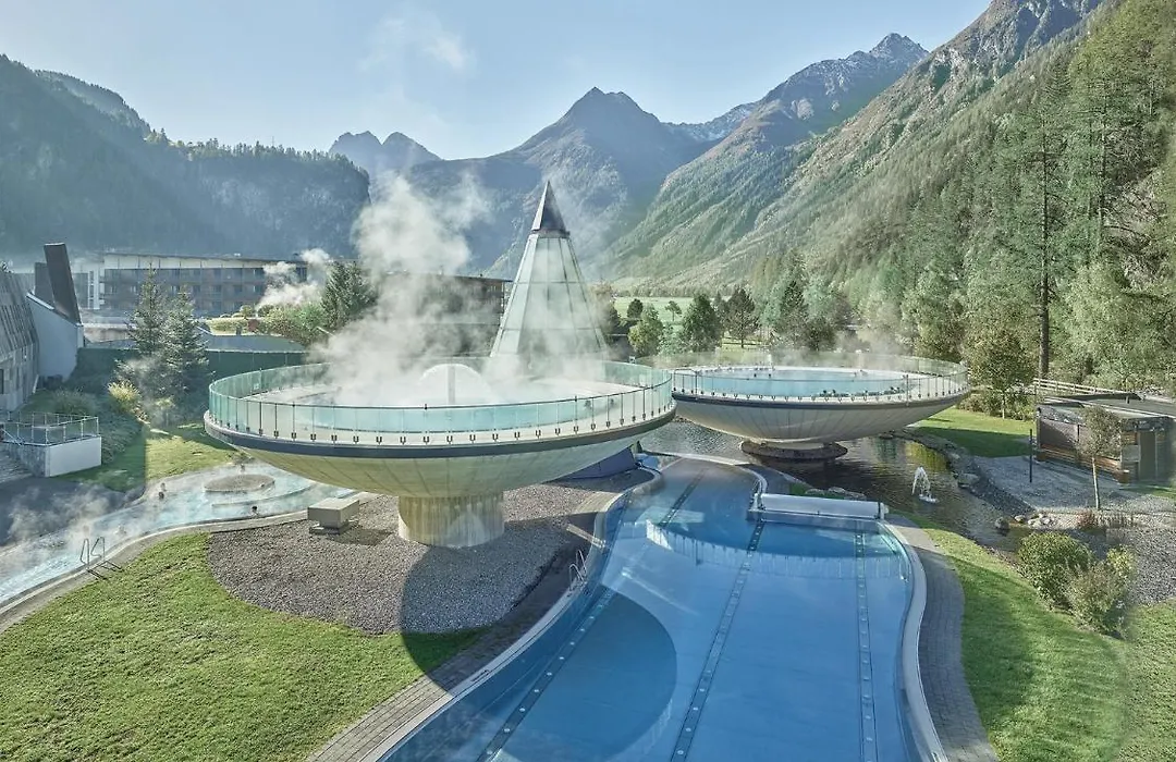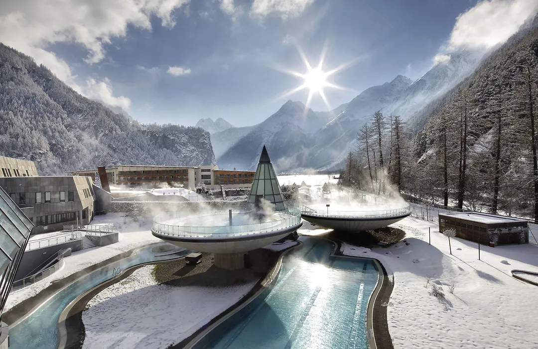 Aqua Dome 4 Sterne Superior Hotel & Tirol Therme Laengenfeld offers luxury spa accommodations, complete with thermal baths and modern amenities. This 4-star Langenfeld hotel features a unique design that incorporates natural materials within the beautiful Ötztal Alps.