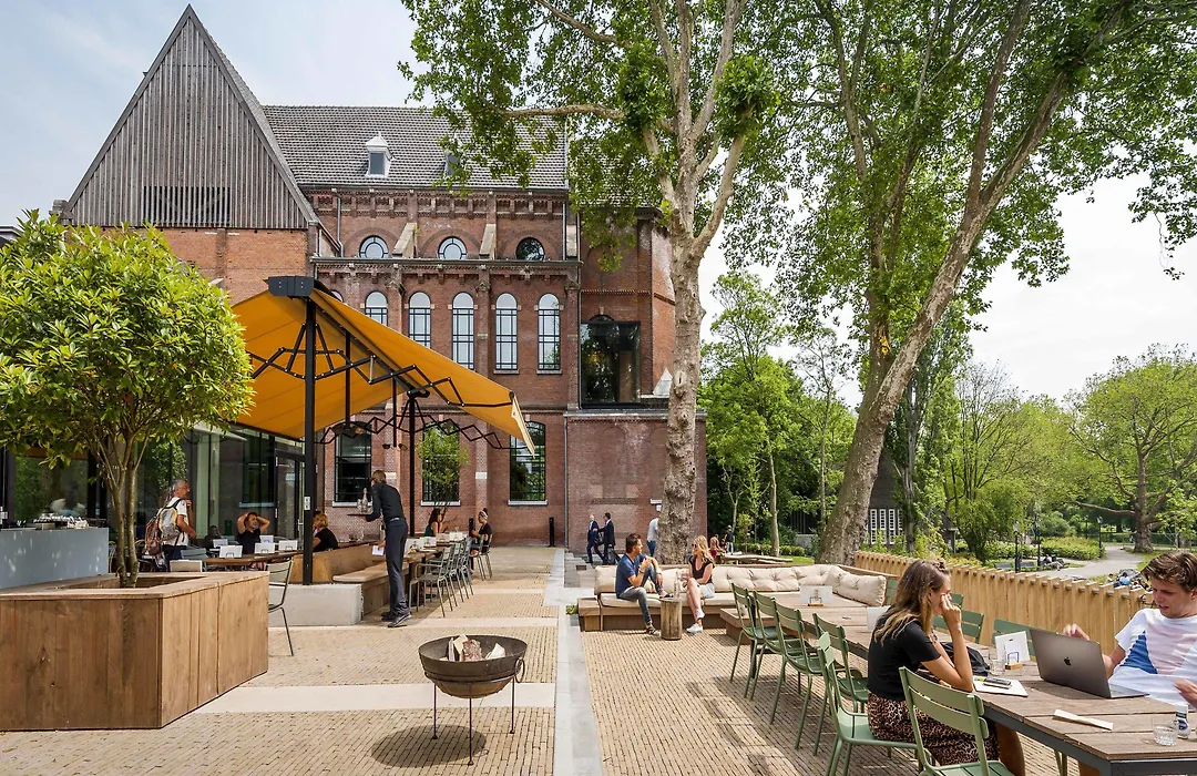The hotel offers versatile meeting spaces, including the Chapel, which can accommodate up to 700 guests. Facilities include a foyer bar for receptions and studio rooms for various setups. Surrounding Oosterpark provides opportunities for outdoor activities and relaxation.