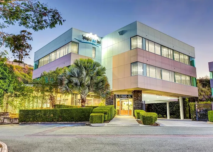 The hotel is situated just 30 minutes from Brisbane CBD, with public transport available via local bus services. The surrounding area offers various outdoor activities including hiking at Spring Mountain Forest Park and playgrounds at Grande Park, making it suitable for families.
