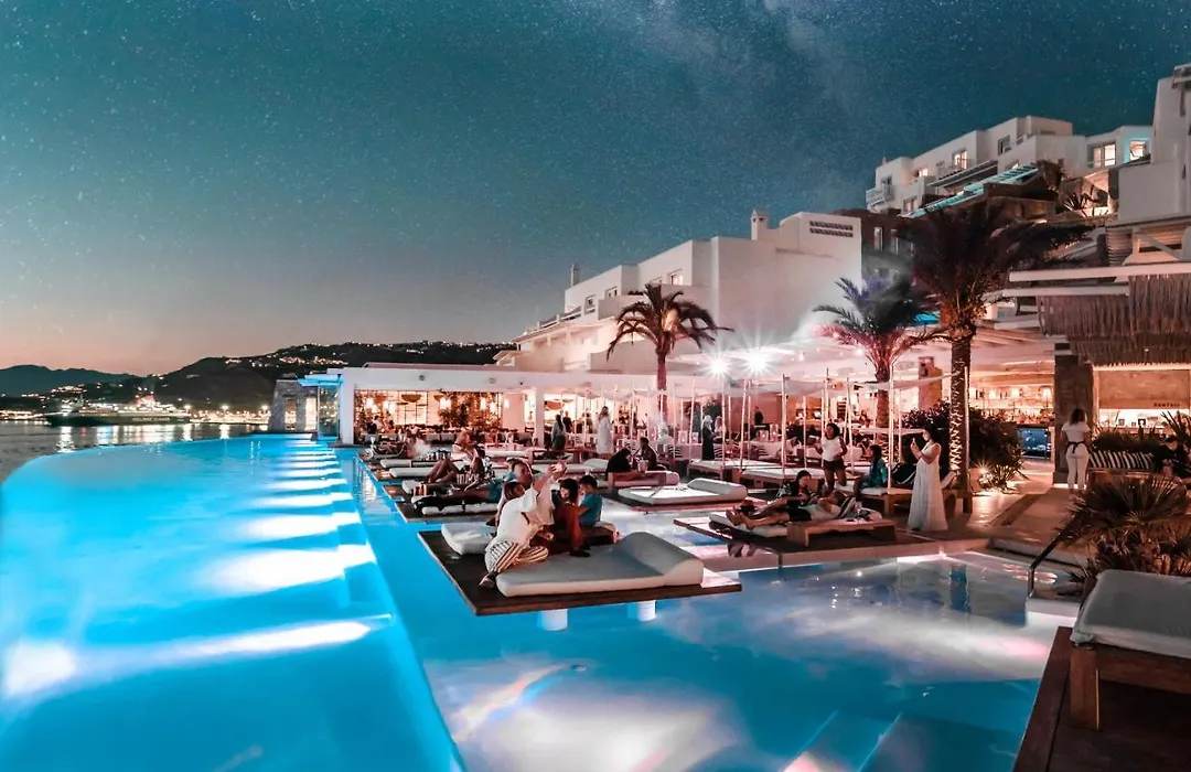 Cavo Tagoo Mykonos, a 5-star Mykonos Town hotel rated 9.1/10 on Booking.com, features an infinity pool with color-changing lighting, along with luxurious rooms offering stunning views of the Aegean Sea. The hotel is known for its contemporary Cycladic architecture and warm Greek hospitality.