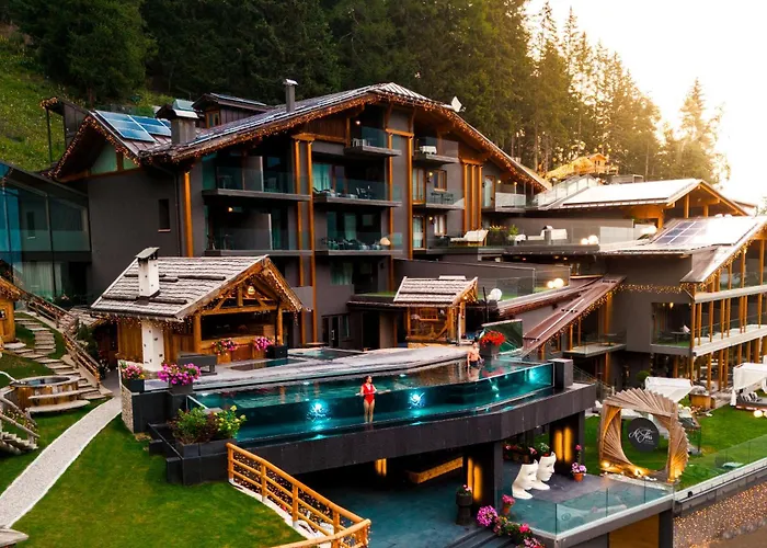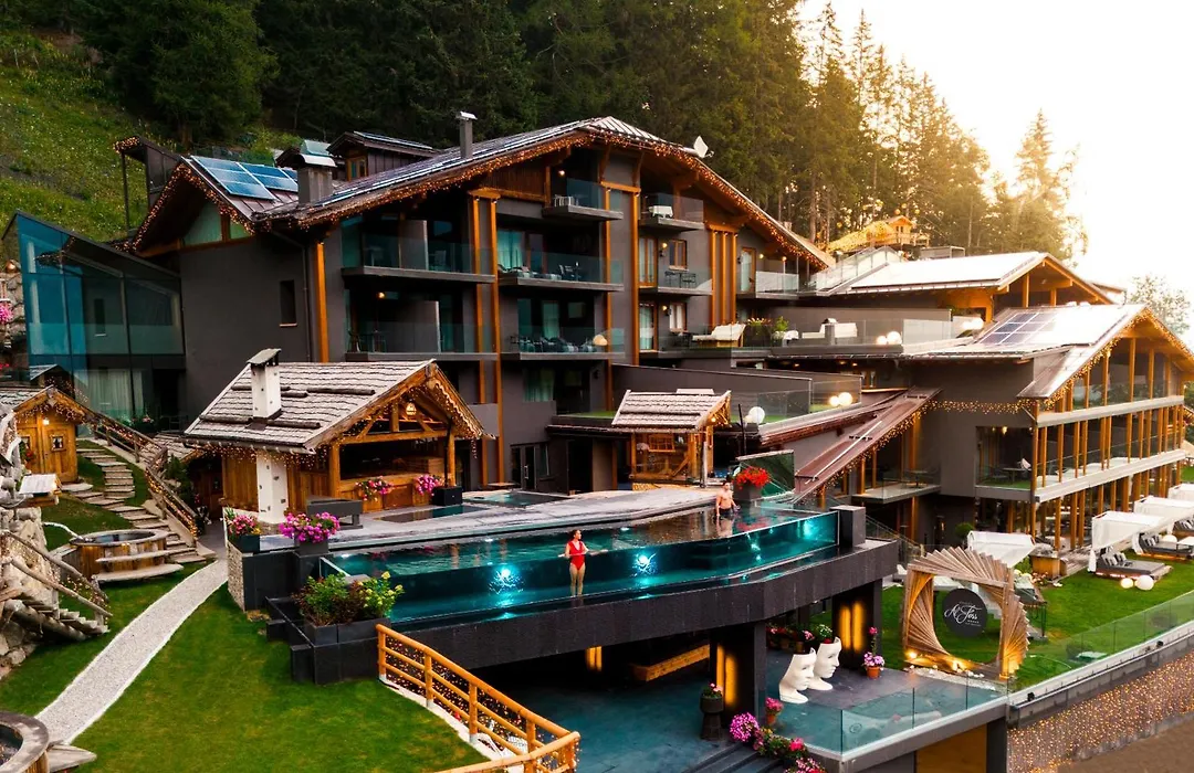 Hotel Chalet Al Foss - Adults Only features a 5-star experience with an infinity pool, panoramic Finnish sauna, and hot tubs. Activities include excursions in the nearby protected areas and various dining options. The hotel has a 9.5/10 Booking.com rating.