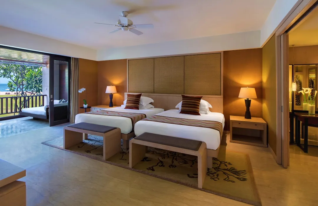 Luxurious accommodations at Conrad Bali include spacious suites and villas, some featuring private pools and direct access to the lagoon pool. Most rooms provide views of the ocean or lush gardens, designed with modern Balinese decor.