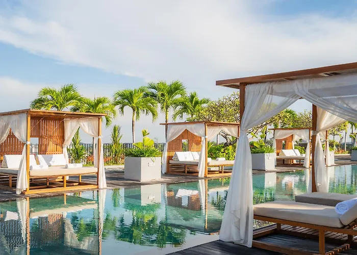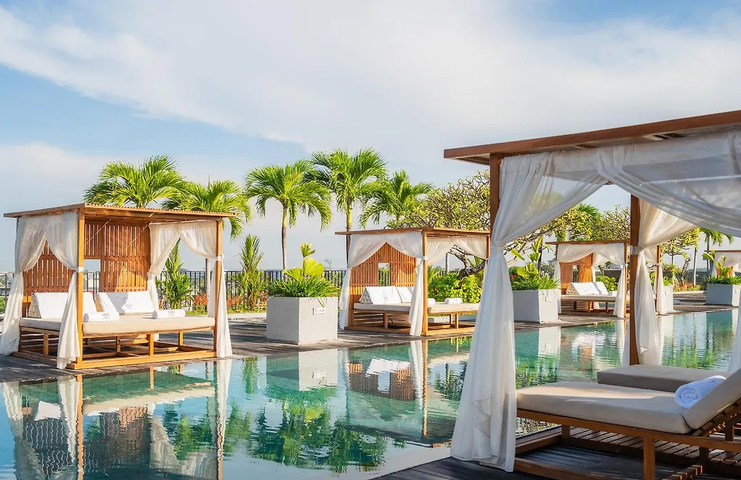 Cross Paasha Bali Seminyak features a large rooftop pool and modern hotel design with luxurious amenities, earning a 5-star rating. The hotel offers a range of services including complimentary WiFi and access to a state-of-the-art gym.