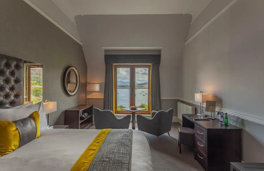 The Cuillin Hills Hotel offers 39 bespoke bedrooms designed with a blend of traditional furnishings and contemporary finishes. Guests can choose from various room types, including the Premier Deluxe rooms with stunning views across the bay of Portree and the majestic Cuillin mountains.