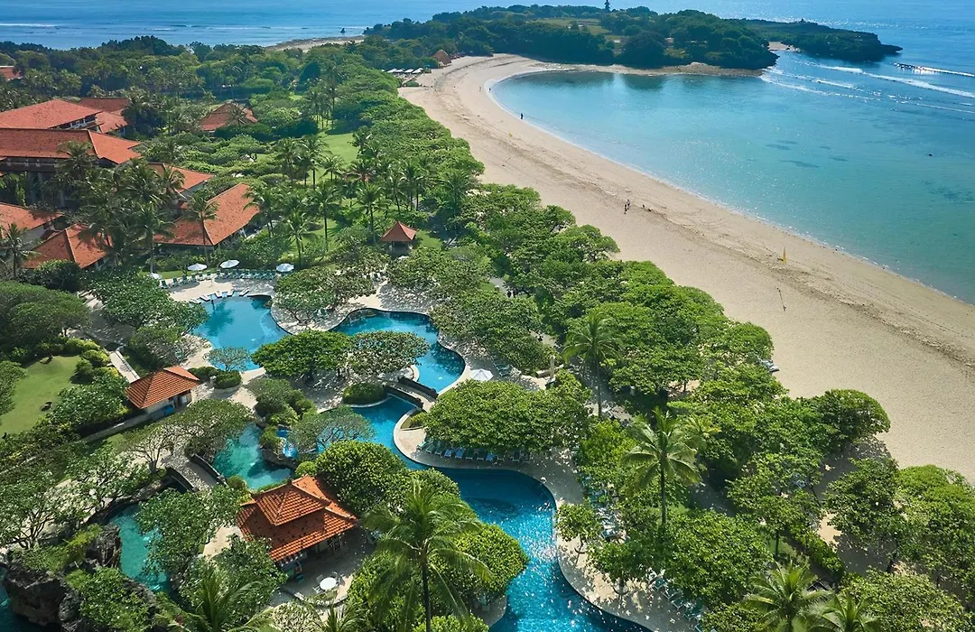 Grand Hyatt Bali features various leisure amenities, including five swimming pools, the adult-only Bay Club Pool, and Kriya Spa offering Balinese treatments. Recreational activities include water sports, beach soccer, and golf on a nine-hole putting green.