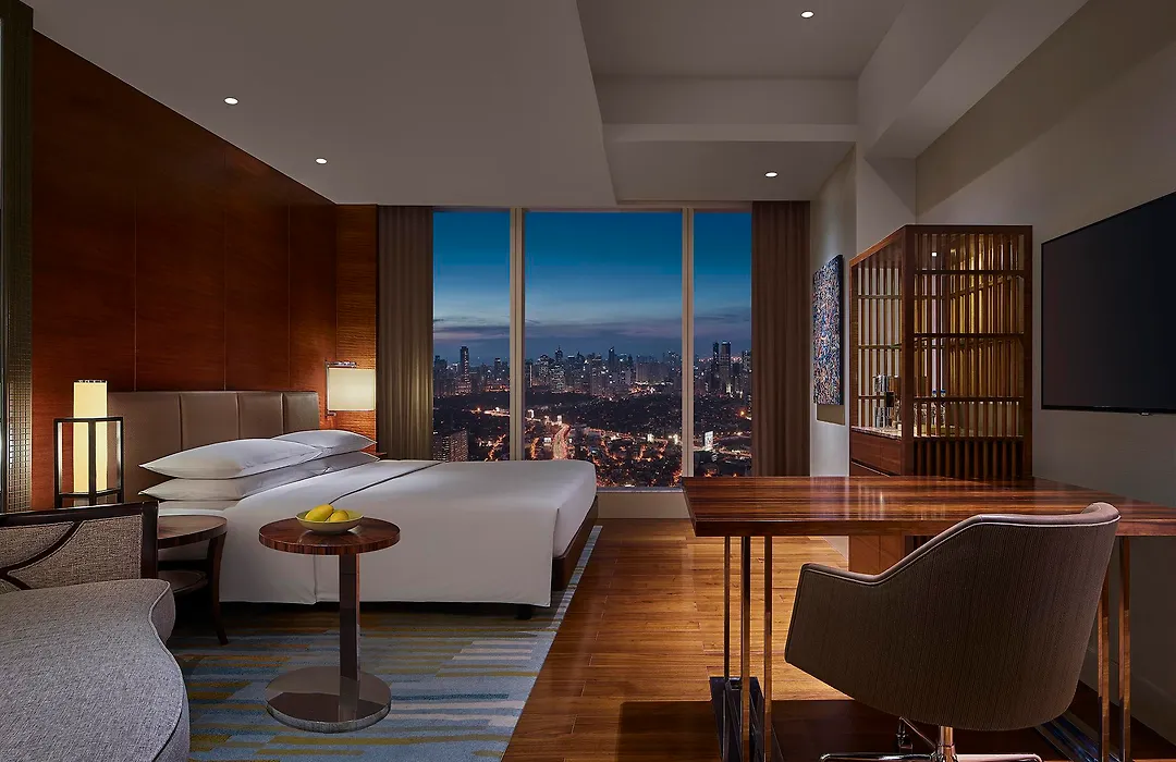 Rooms at Grand Hyatt Manila feature air-conditioning, a private bathroom with free toiletries, a flat-screen TV, and a minibar. Each unit includes a desk and essential amenities such as a coffee machine and fridge, providing a comfortable stay for guests.