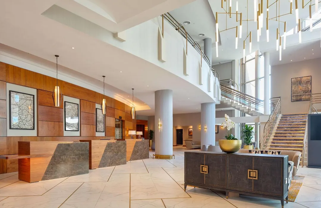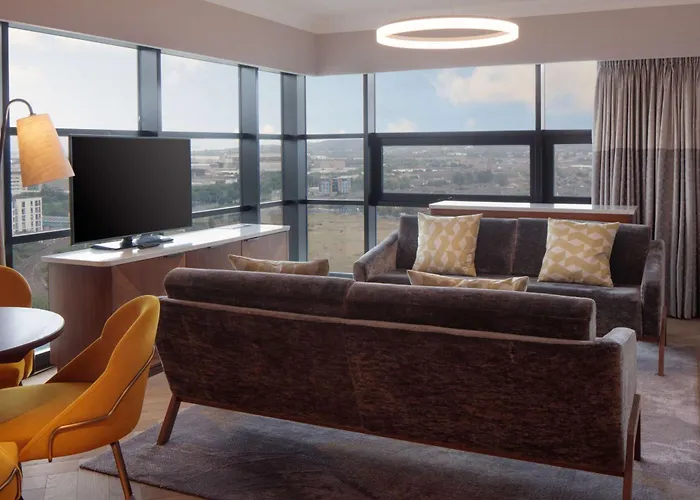 Hilton Belfast, a 4-star hotel with an 8.5/10 rating, offers modern amenities with riverfront views and a prime location in Cathedral Quarter. The hotel provides accessible dining, extensive meeting facilities, and family-friendly accommodations.