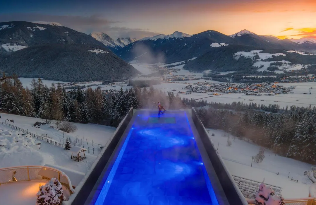 Alpin Panorama Hotel Hubertus, a 5-star accommodation rated 9.4/10 on Booking.com, features a unique Sky Pool and a wellness center with six heated indoor and outdoor pools. This Olang hotel offers diverse dining options and a variety of leisure activities for guests to enjoy amidst the stunning Dolomite mountains.