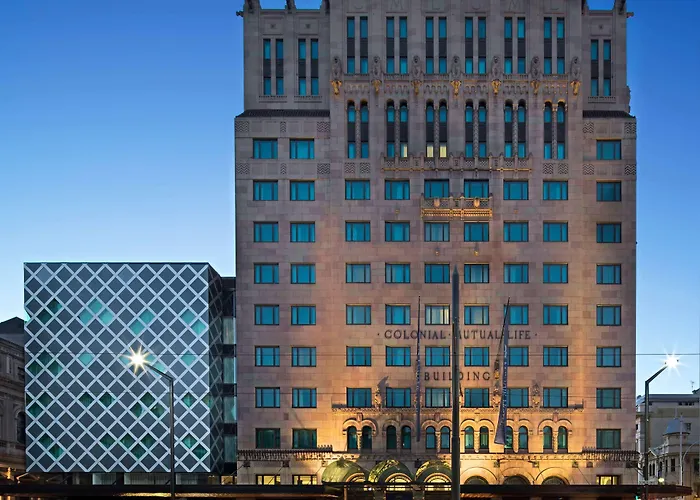 Mayfair Hotel offers luxurious 5-star accommodations in Adelaide, rated at 8.6/10 on Booking.com. This boutique hotel features an elegant design, exceptional dining options, and is home to a rooftop bar with stunning views. The hotel is noted for its personalized service and unique culinary experiences, including honey produced from its rooftop beehive.
