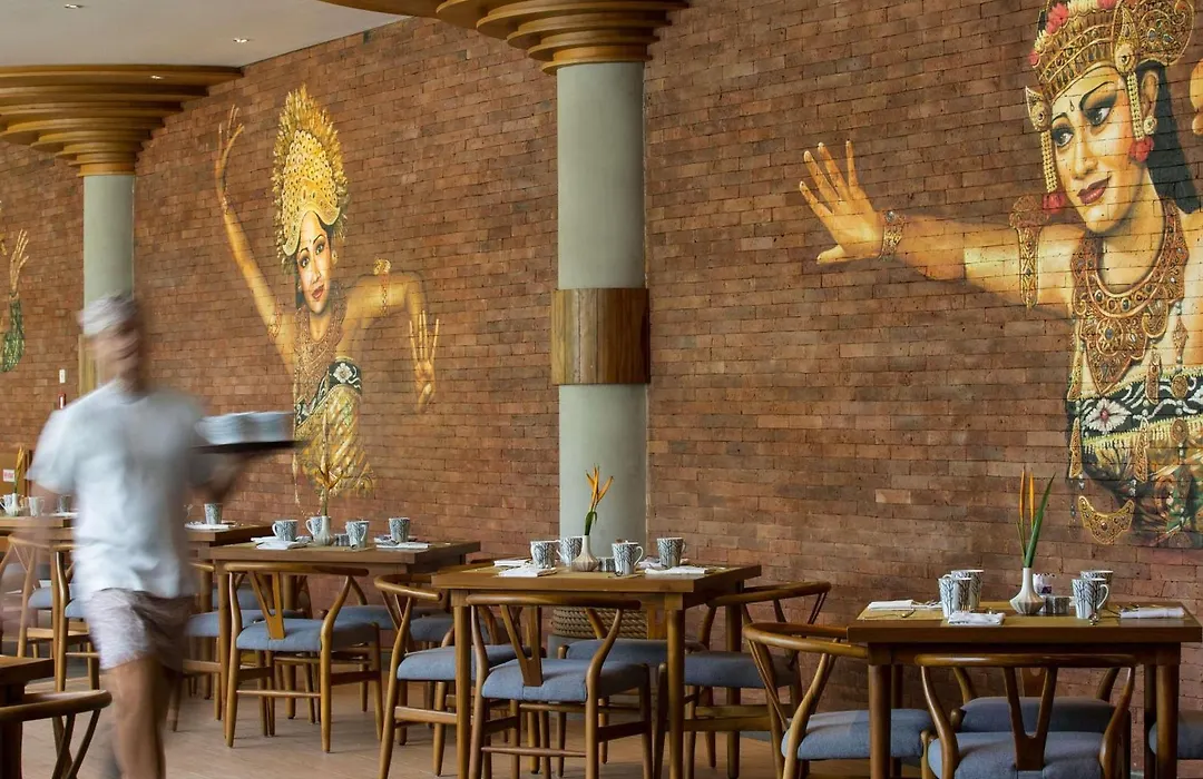 Dining options include five restaurants and three bars, featuring Indonesian and Mediterranean cuisines. Guests can enjoy themed dining experiences such as Seafood BBQ & Fire Dance, which showcases a variety of fresh seafood dishes.