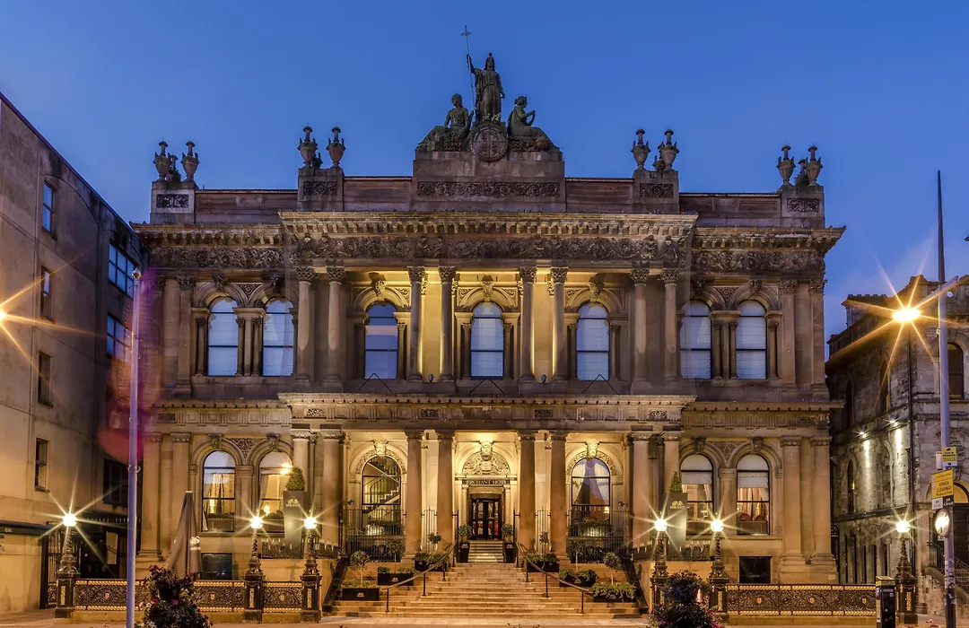 The Merchant Hotel's business facilities include meeting spaces equipped with 50' plasma screens and high-speed internet. Nearby transport options include bus services from Custom House Square and Royal Avenue, while major landmarks like the Grand Opera House and Titanic Belfast are within walking distance.