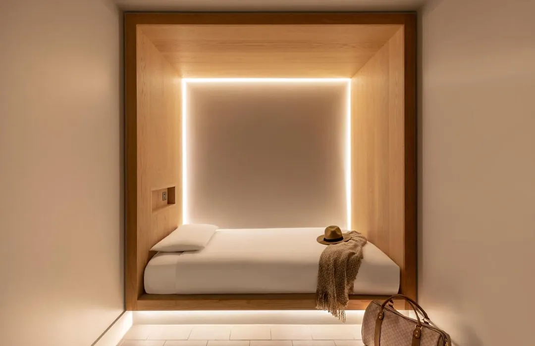 The rooms at Zedwell Hotel Piccadilly Circus are designed to promote deep relaxation with their windowless cocoons, featuring natural oak furnishings, Hypnos mattresses, and Egyptian cotton sheets. Each cocoon is equipped with a rainfall shower and integrated circadian lighting, enhancing the guest experience.