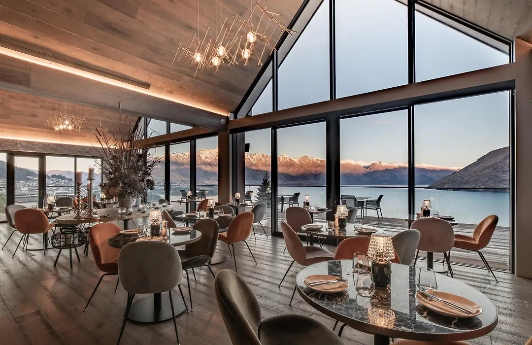 Dining at the Nest restaurant includes modern takes on Mediterranean classics with floor-to-ceiling windows overlooking the lake. Exclusive selections of Central Otago wines and New Zealand gin and tonics are available at the Nest cocktail lounge. Room service is also offered for in-room dining.