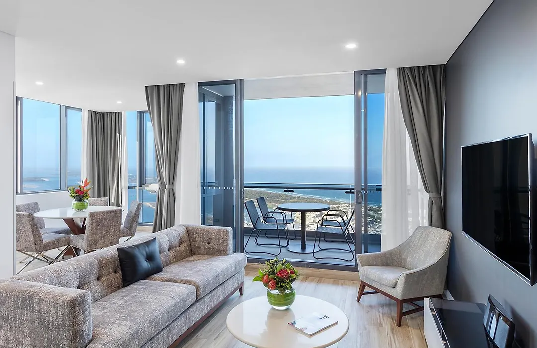 Each suite at Meriton Suites Southport includes contemporary design elements and full-sized European kitchens, with options for 1, 2, or 3 bedrooms. Suites feature private balconies with panoramic views of the Pacific Ocean and hinterland, oversized living areas, and include amenities like free unlimited Wi-Fi and HD flat-screen TVs.