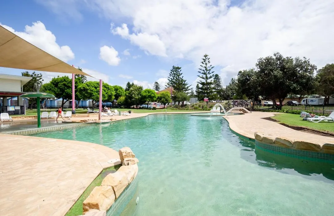 Leisure options at Toowoon Bay Holiday Park include a resort-style pool, children's playground, and access to North Shelly Beach, known for its clean, patrolled waters. Nearby attractions feature Swaddling Park and golf courses for outdoor activities. Family-friendly amenities include school holiday activities and a jumping pillow.