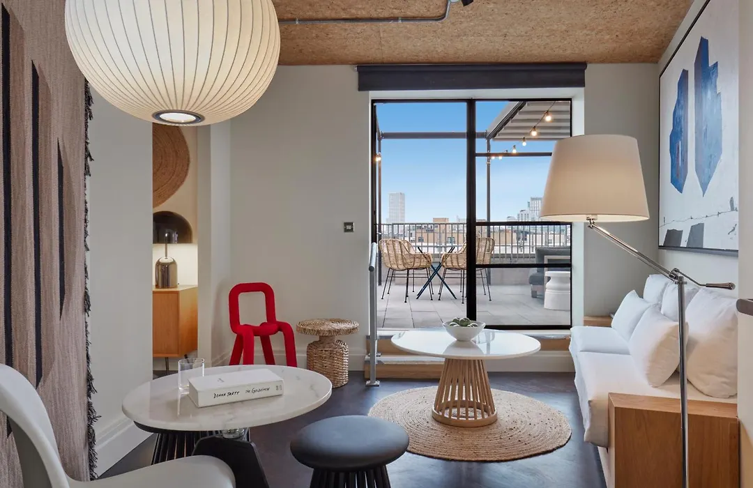 The rooms and suites at One Hundred Shoreditch offer super comfy beds and bespoke artwork by Jacu Strauss. Options include Studio rooms and interconnecting configurations for larger groups, accommodating up to six guests with hybrid workspaces, seating areas, and private terraces for selected suites.