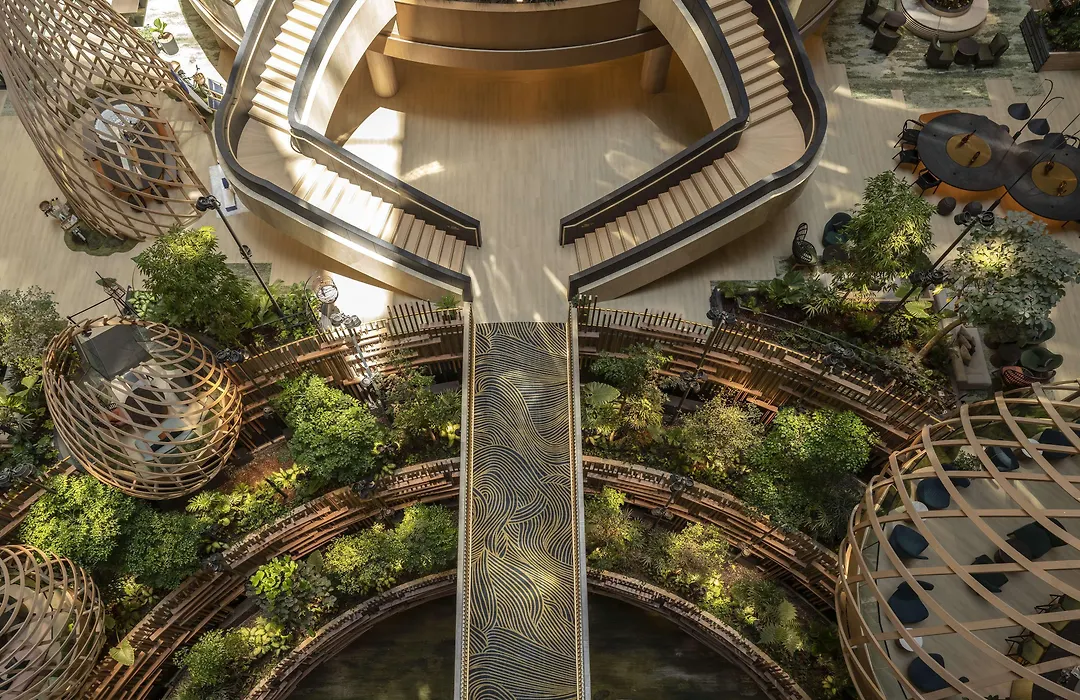 Dining options encompass three restaurants: Peppermint serves halal-certified international cuisine, while Peach Blossoms specializes in Cantonese dishes. The Skyline Bar offers light snacks alongside beverages with panoramic views. Guests can indulge in local flavors at the outdoor dining areas, complemented by organic produce from the hotel's Urban Farm.