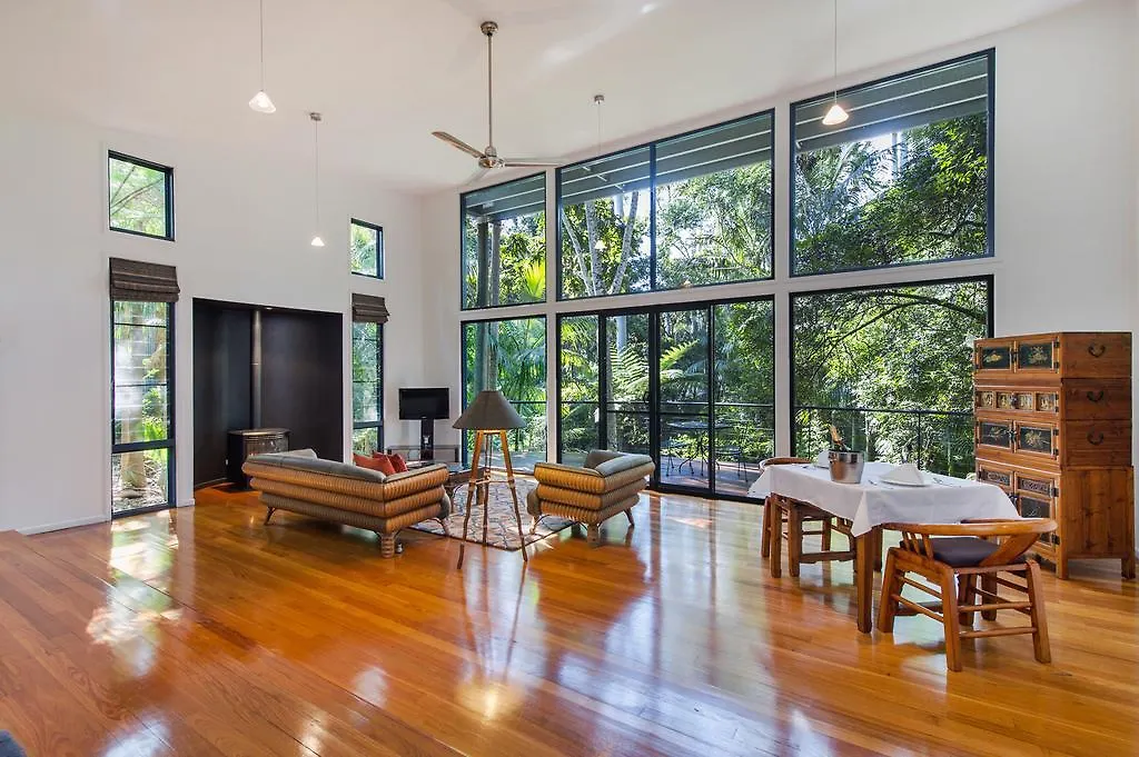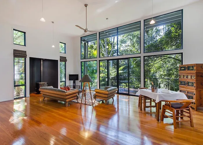 Leisure facilities include a hot tub, fitness center, and a garden designed for relaxation. The retreat is close to Tamborine National Park, providing opportunities for hiking and wildlife spotting, including local species such as wallabies and lyrebirds.