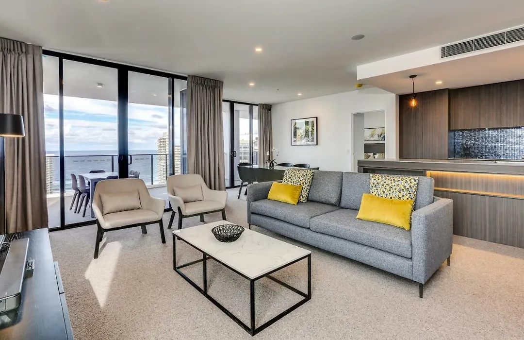 Each apartment at Qube Broadbeach includes a fully equipped kitchen with European appliances, air conditioning, and laundry facilities. The 3-bedroom premium ocean view apartment accommodates up to six guests and features a high-definition TV and relaxation area.