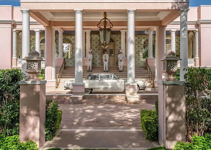 Rajmahal Palace Raas is a 5-star heritage hotel featuring 13 rooms and suites that reflect both classic and contemporary styles. This luxury hotel includes an art-deco swimming pool, multiple dining options, and extensive gardens designed for private events.