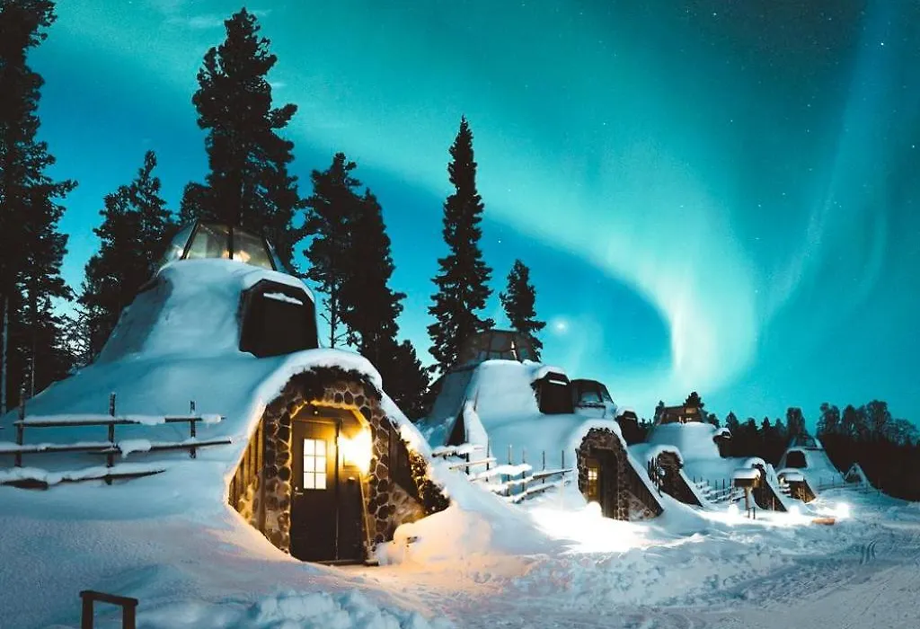 Apukka Resort, a 4-star Rovaniemi hotel rated 9.2/10 on Booking.com, features unique accommodations including glass igloos and modern cabins designed for optimal Aurora viewing. Amenities include a restaurant, sauna experiences, and a variety of winter activities.