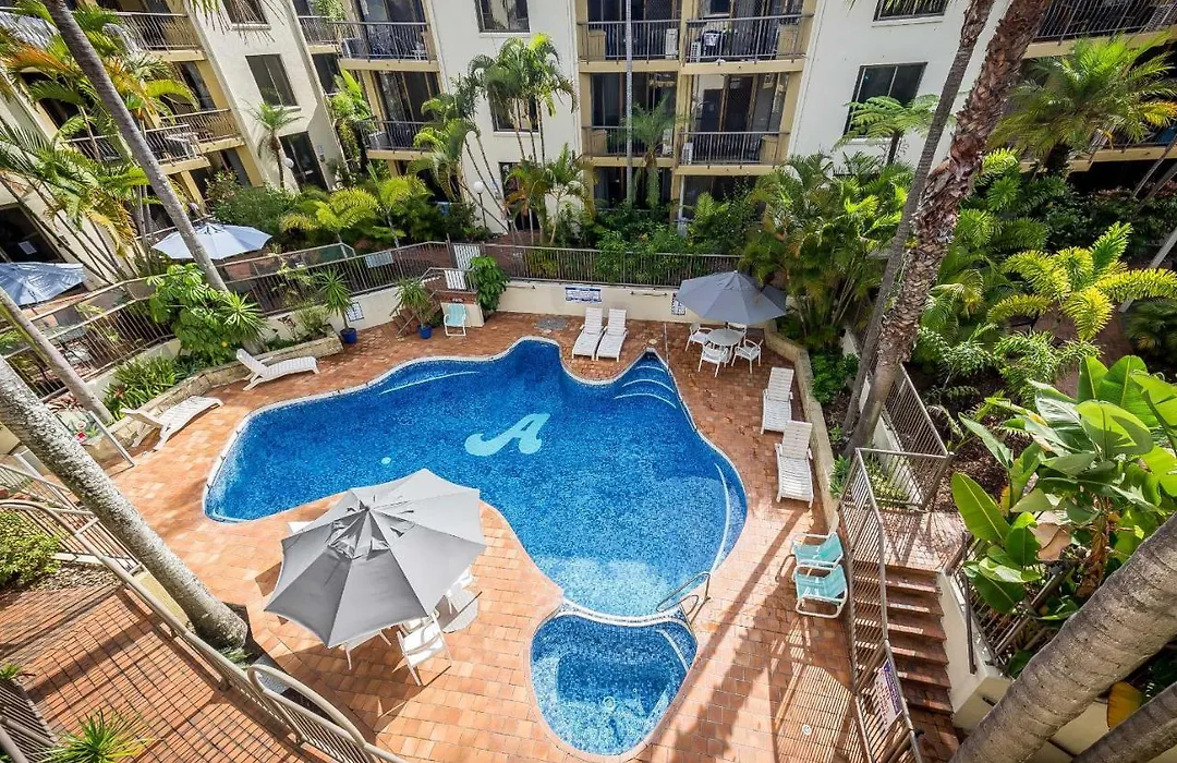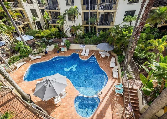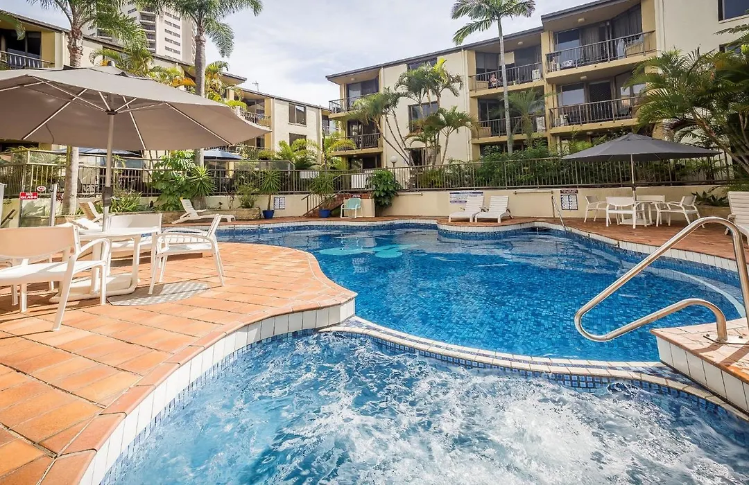Aussie Resort, a 4-star Gold Coast hotel with a 7.5/10 Booking.com rating, offers self-contained one-bedroom apartments ideal for a relaxing seaside break. Featuring a unique heated swimming pool shaped like Australia, it provides a range of family-friendly amenities.