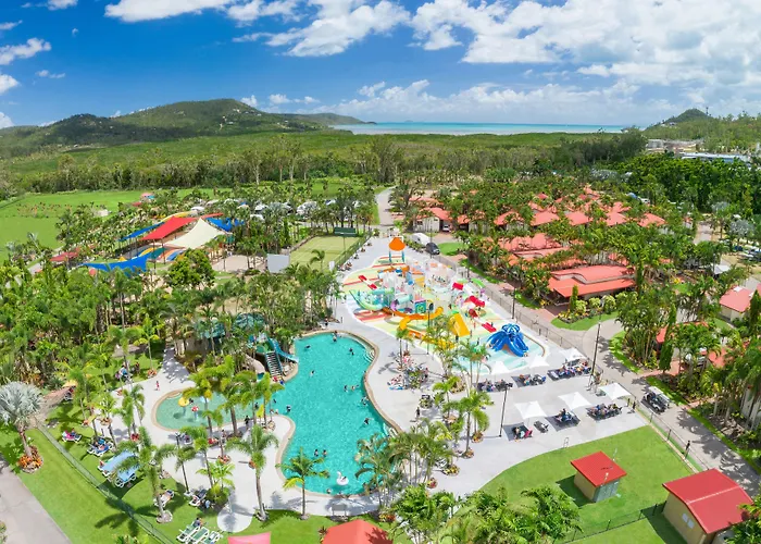 The resort features extensive leisure activities, including an 18-hole mini golf course, tennis courts, and outdoor movies screened regularly. The resort's waterpark, touted as the largest in Airlie Beach, includes vibrant slides and a lagoon-style pool. Kids can also interact with animals at the resort's animal park.