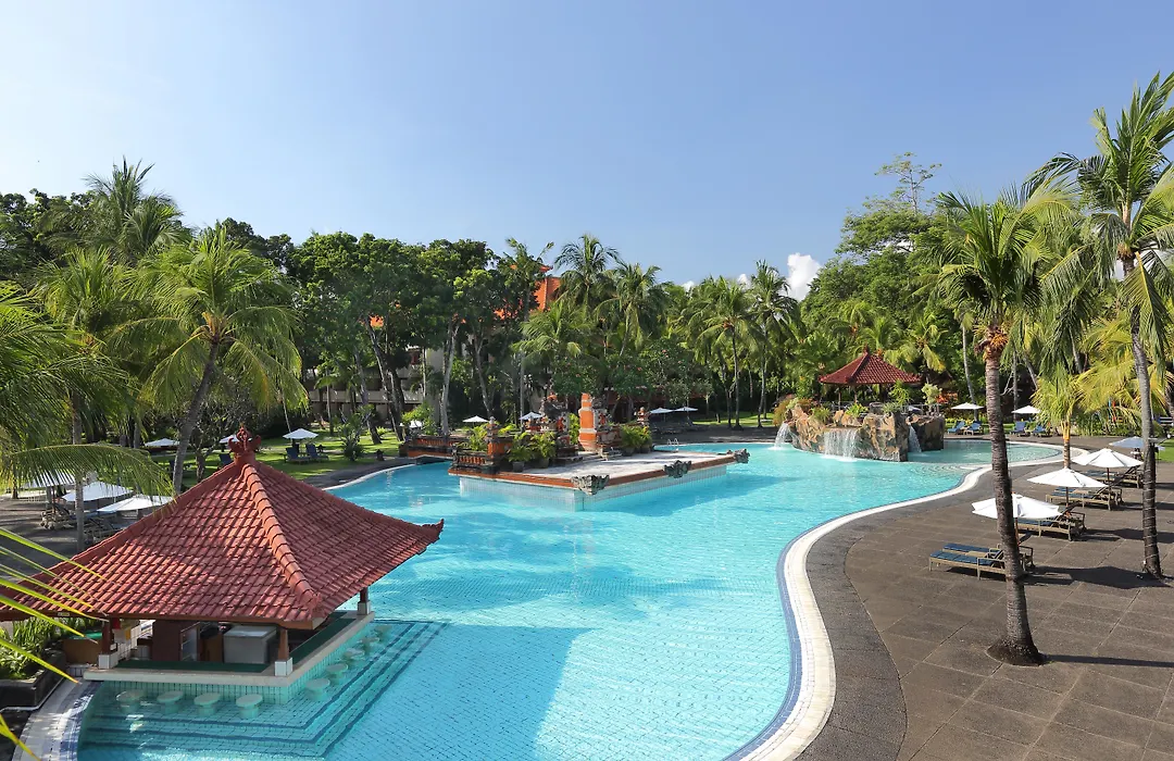 Bintang Bali Resort, a 5-star hotel with an 8.3/10 Booking.com rating, spans over six hectares of tropical gardens and features direct beachfront access. Guests can enjoy a variety of amenities, including a free-form swimming pool with a cascading waterfall, health club, and several dining options.