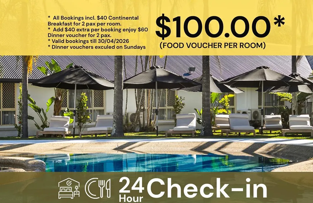 The fully licensed Terrace Restaurant serves dinner and breakfast six days a week, offering modern cuisine created from local produce, including fresh seafood from Northern Rivers Seafood. Guests can also enjoy drinks and light snacks at the Terrace Wine Bar located by the saltwater lagoon pool.