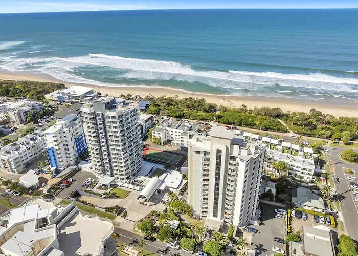Leisure amenities include two heated swimming pools, a sauna, a spa, and tennis courts, alongside a covered BBQ area. Guests can enjoy direct access to Maroochydore's family-friendly patrolled beach from the resort.