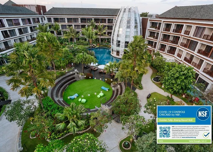 Golden Tulip Jineng Resort Bali is a 4-star hotel featuring spacious grounds with a distinctive design inspired by the sacred lotus flower. It offers a luxury spa, outdoor pools, and easy access to the bustling commercial area of Kuta. The hotel is rated 7.5/10 on Booking.com.