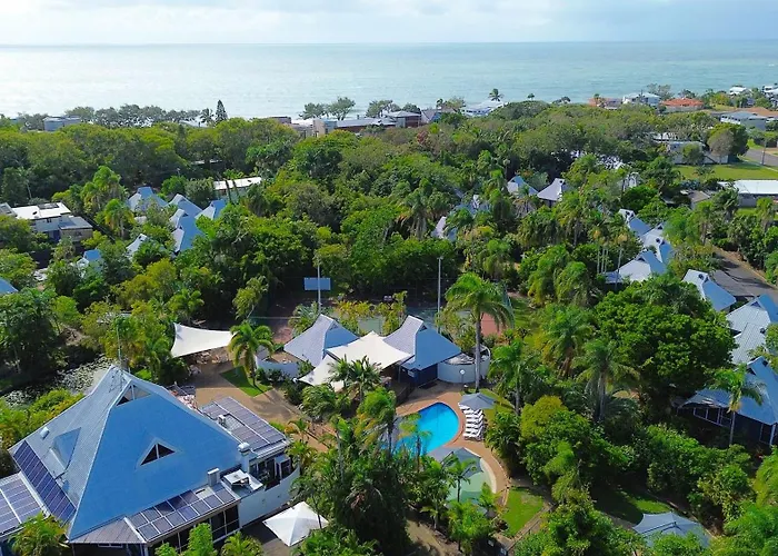 Kellys Beach Resort, a 4-star family-owned establishment, offers self-contained Eco Villas within 2 hectares of gardens. It is situated just one block from Kellys Beach, recognized for swimming and local dining options.