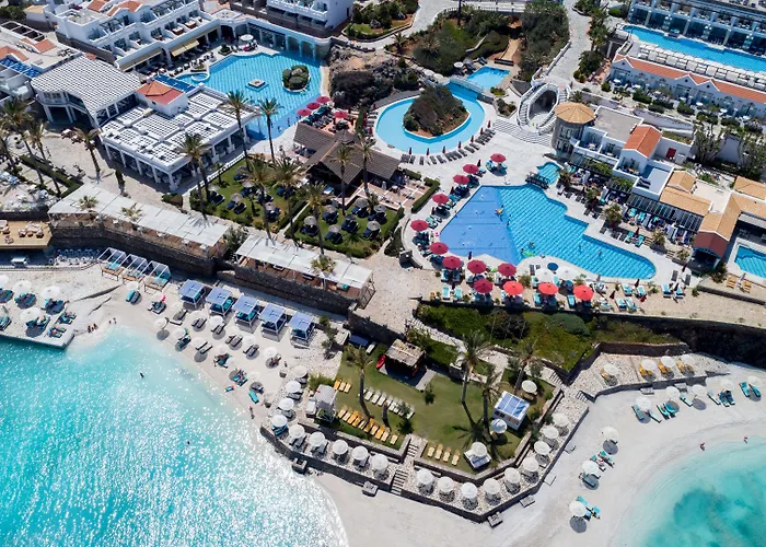 Minos Imperial Luxury Beach Resort & Spa Milatos, a 5-star hotel with an 8.2/10 rating on Booking.com, offers a luxurious experience with private pools, a beach area, and an elegant spa. This family-friendly resort features multiple dining options and extensive leisure facilities.
