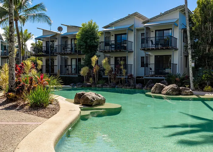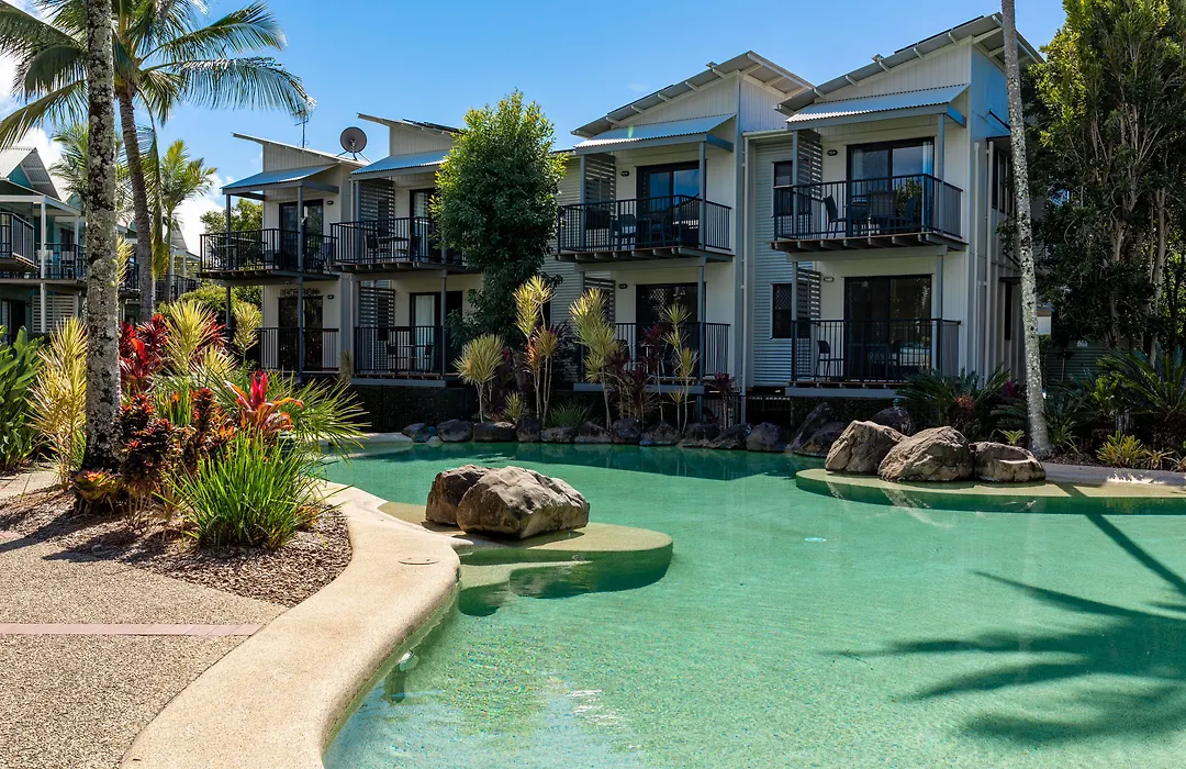 Noosa Lakes Resort features three large lagoon-style swimming pools amidst landscaped gardens, offering a relaxing resort environment. This 4-star Noosaville hotel provides a variety of room options, including Two Bedroom Dual Key Townhouses perfect for families. The resort is located just 200 meters from the Noosa Marina, providing access to diverse dining and recreational options.
