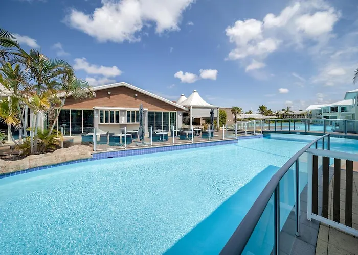 Leisure facilities include a large lagoon pool, a heated jacuzzi, and children's wading pools. The resort is also close to recreational spots such as Toboggan Hill Park and Bagnalls Beach, offering outdoor activities.