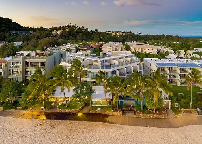 On The Beach Noosa Resort offers five-star beachfront accommodations with stunning ocean views, located on Hastings Street, a cosmopolitan strip filled with cafes, restaurants, and shops. Guests enjoy direct access to Noosa Main Beach and a range of luxurious amenities including a saltwater pool and spa facilities.