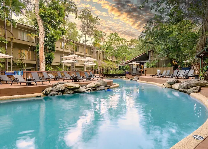 Guests can unwind at the Treetops Spa or enjoy poolside dining. The hotel is conveniently located near several attractions including the Agincourt Reef and Rainforest Habitat Wildlife Sanctuary.