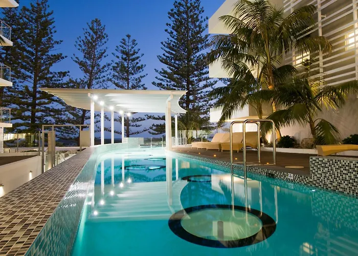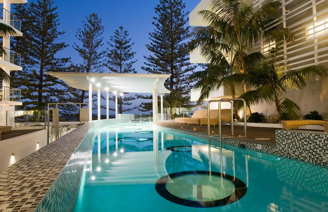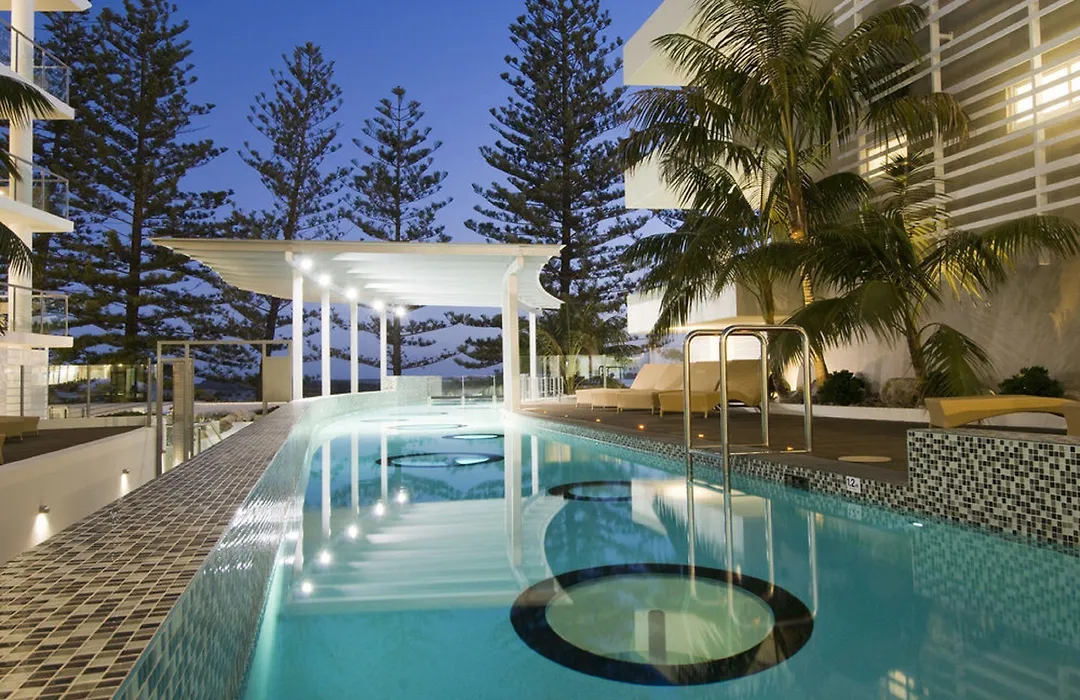 Rumba Beach Resort, a 5-star Caloundra hotel rated 9.0/10 on Booking.com, features beachfront access to Bulcock Beach and modern accommodations. Amenities include a glass-bottomed heated lap pool, a giant Jacuzzi, and an on-site bar and restaurant.