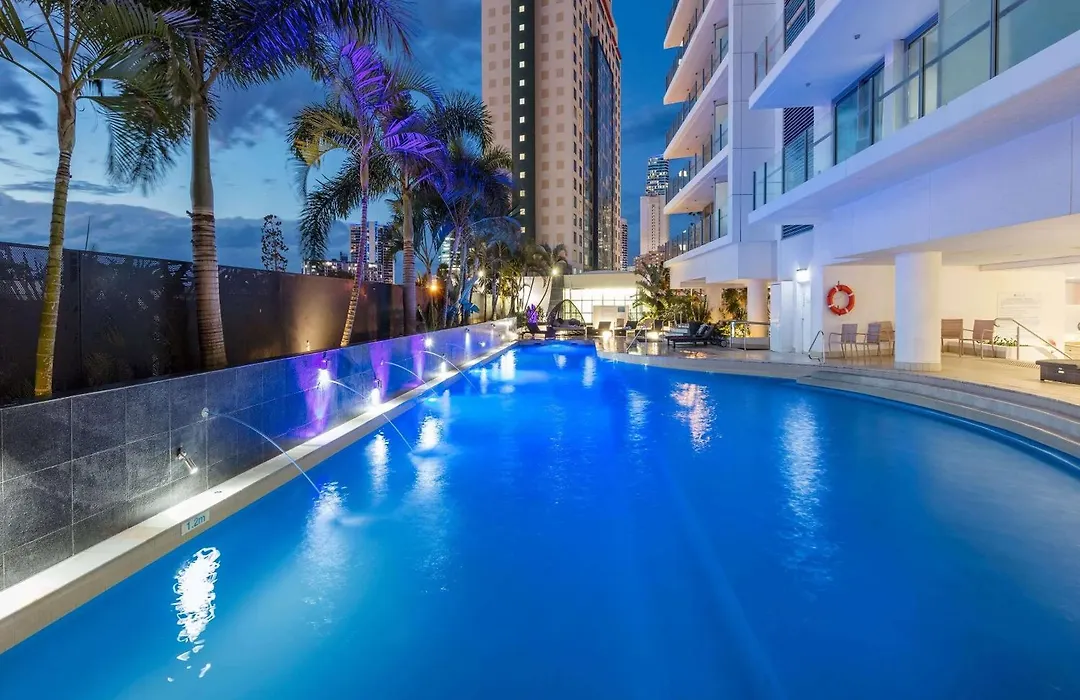 Recreational spaces include an outdoor area with a large pool, whirlpool, BBQ area, and a gym. The hotel is close to various theme parks, including Movie World and Sea World, making it suitable for family outings.