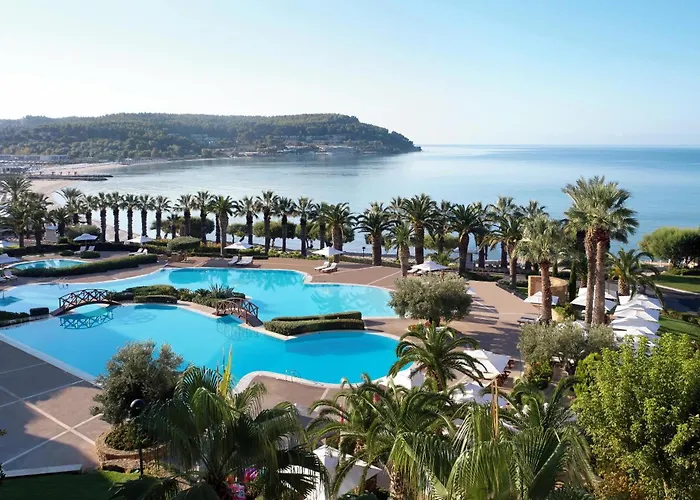 Sani Beach, a 5-star hotel rated 9.6/10 on Booking.com, offers luxury accommodations amid stunning coastal scenery. The property features a variety of facilities including exclusive beaches, a lavish spa, and numerous dining options.