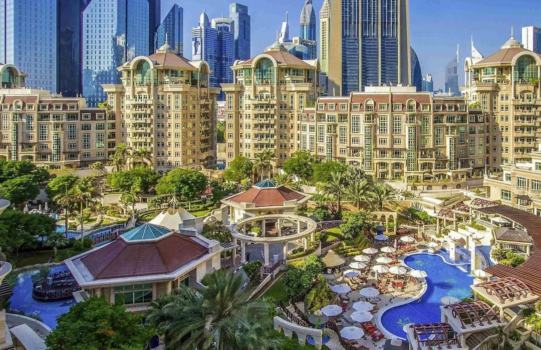 Dining options include the Double Decker Pub, an English-themed pub, and Pergolas, an all-day dining restaurant serving international dishes. The hotel also features two lobby cafés and Middle Eastern cuisine served in a relaxed al fresco atmosphere.