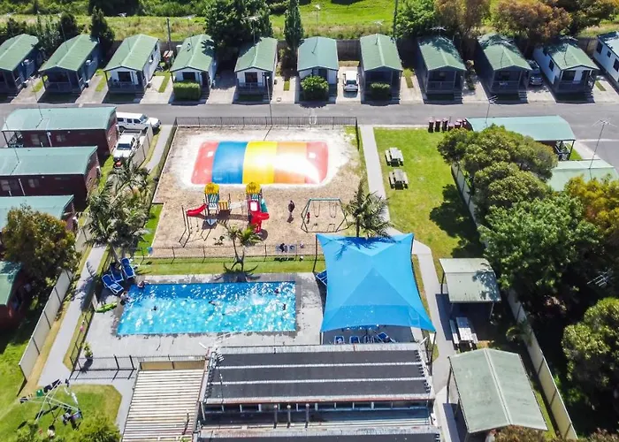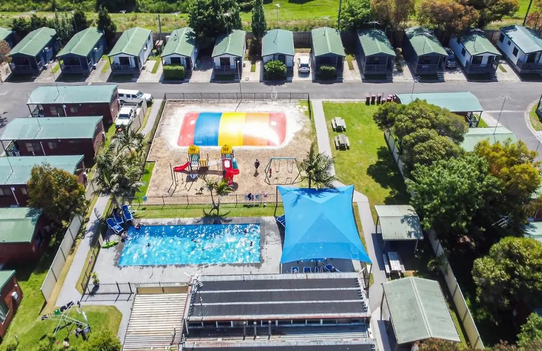 Tasman Holiday Parks - Geelong is a 4-star family-friendly holiday park featuring a variety of accommodations including cabins and powered sites, set amidst gum trees near the Barwon River. Amenities include two swimming pools, BBQ areas, and a large jumping pillow, making it suitable for both relaxation and recreation.