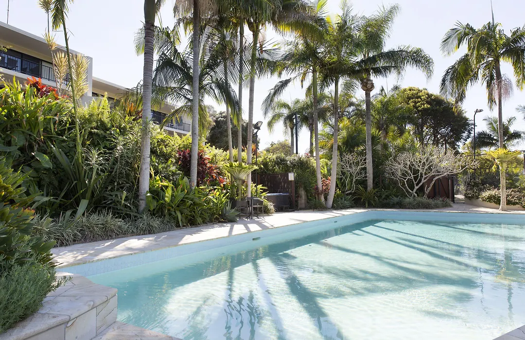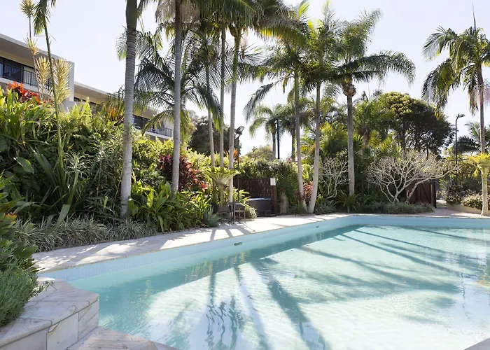 The Oasis Apartments And Treetop Houses offers 4-star accommodations on 2 hectares of tropical gardens adjacent to the white sands of Tallow Beach. Guests enjoy access to resort facilities like a heated pool, spa, sauna, and a floodlit tennis court. This Byron Bay hotel is ideal for diverse families and groups seeking both privacy and recreational options.